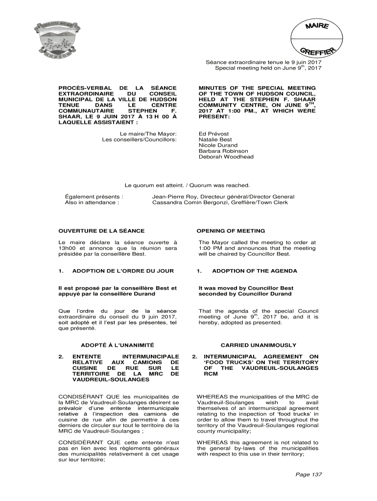 Since extraordinaire tenure LE 9 join 2017 TH Special meeting held on June 9, 2017PROCSVERBAL DE LA SINCE EXTRAORDINAIRE DU CONSENT MUNICIPAL DE LA VILLA DE HUDSON TENURE DAYS LE Center COMMUNAUTAIRE