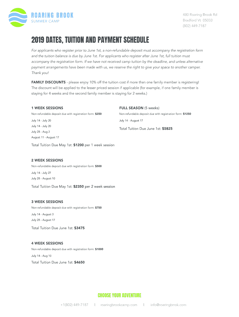 (802) 44971872019 DATES, TUITION AND PAYMENT SCHEDULE