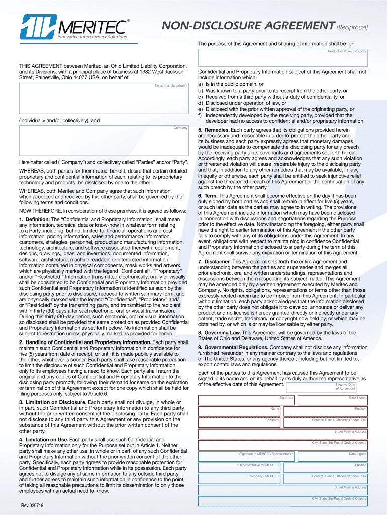 What is the purpose of non-disclosure agreementreciprocal - meritec?