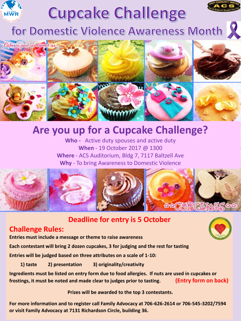 Are you up for a Cupcake Challenge? Who is an Active duty spouses and active duty When 19 October 2017 1300 Where ACS Auditorium, Bldg 7, 7117 Caldwell Ave Why To bring Awareness to Domestic ViolenceDeadline