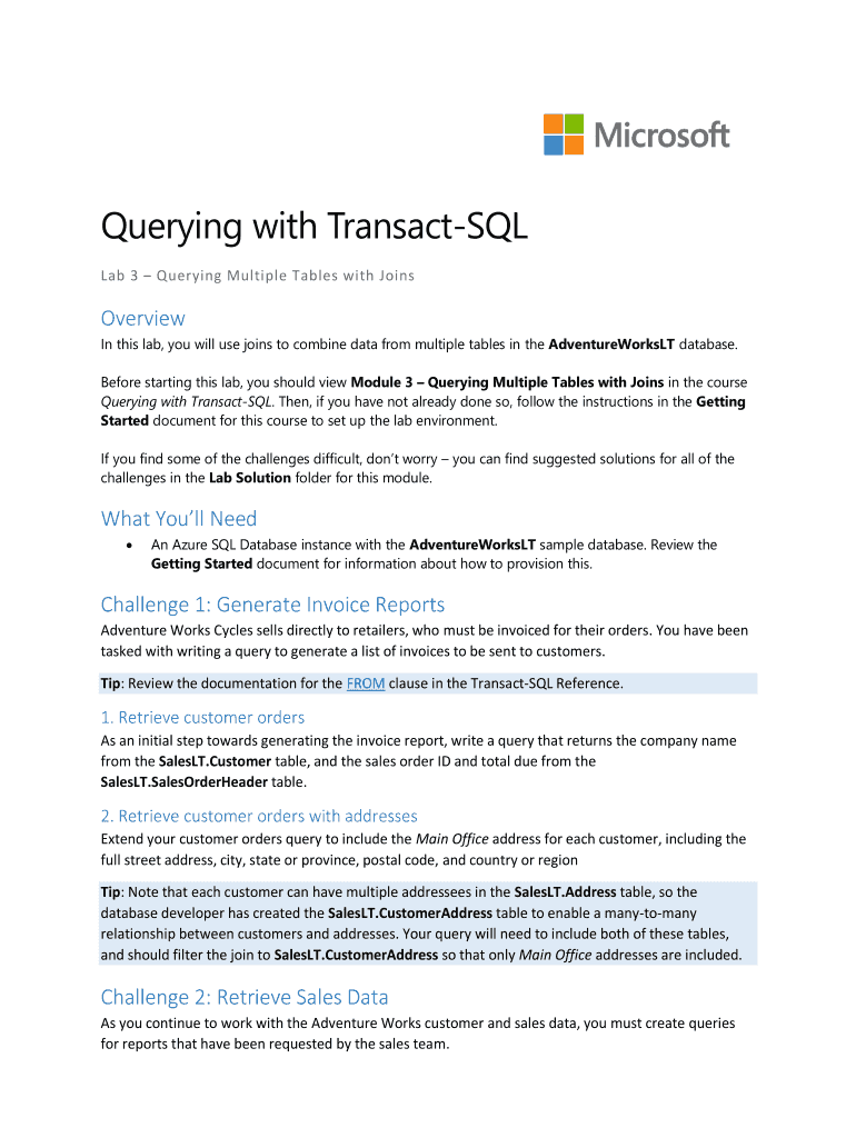 Querying with Transact SQL Lab 3 Querying Multiple Tables with JoinsOverview In this lab, you will use joins to combine data from multiple tables in the AdventureWorksLT database. Before starting