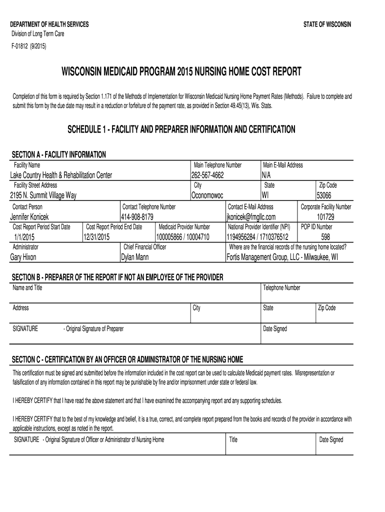 DEPARTMENT OF HEALTH SERVICES Division of Long Term Reinstate OF WISCONSINF01812 (9/2015)WISCONSIN MEDICAID PROGRAM 2015 NURSING HOME COST REPORT Completion of this form is required by Section 1.171