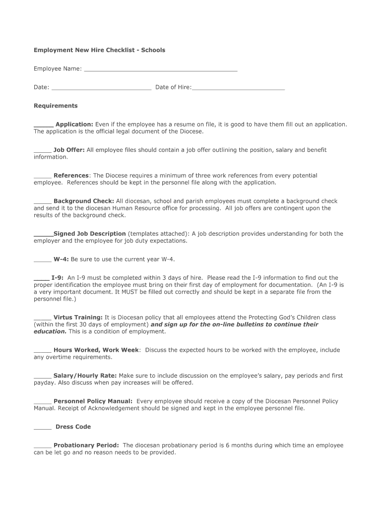 Employment New Hire Checklist Schools Employee Name: Date: Date of Hire: Requirements Application: Even if the employee has a resume on file, it is good to have them fill out an application. The application
