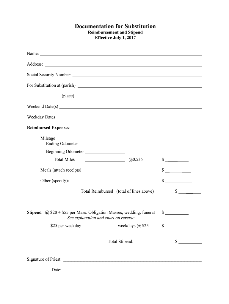 Documentation for Substitution Reimbursement and Stipend Effective July 1, 2017, Name: Address: Social Security Number: For Substitution at (parish) (place) Weekend Date(s) Weekday Dates Reimbursed