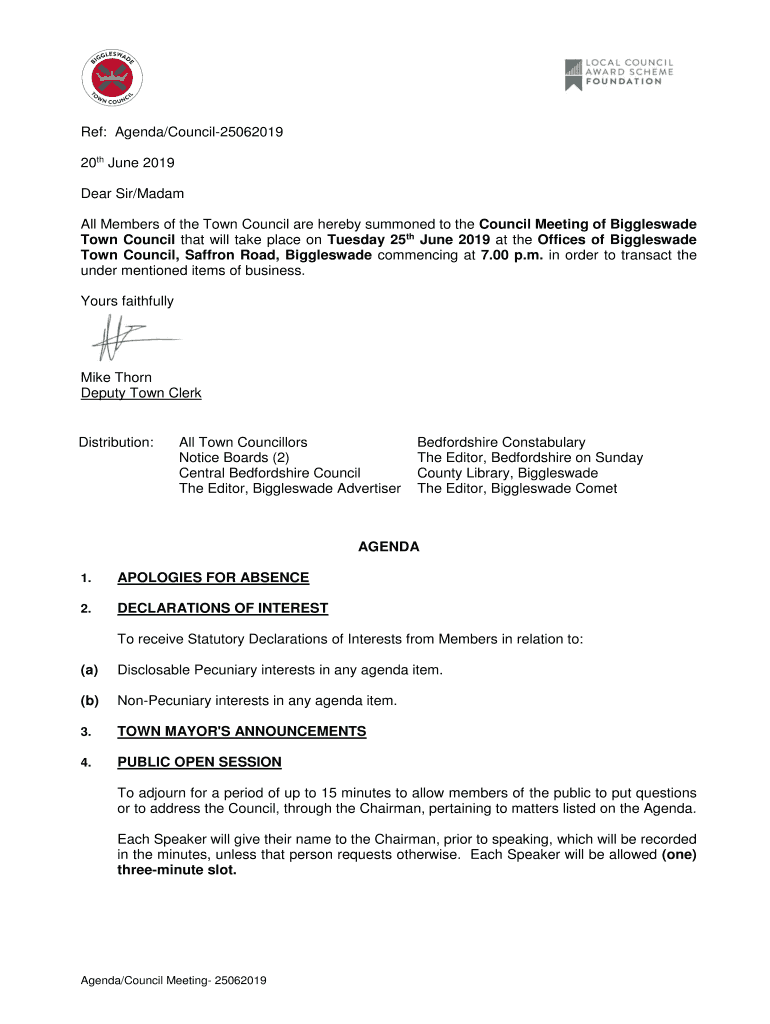 All Members of the Town Council are hereby summoned to the Council Meeting of Biggles wade