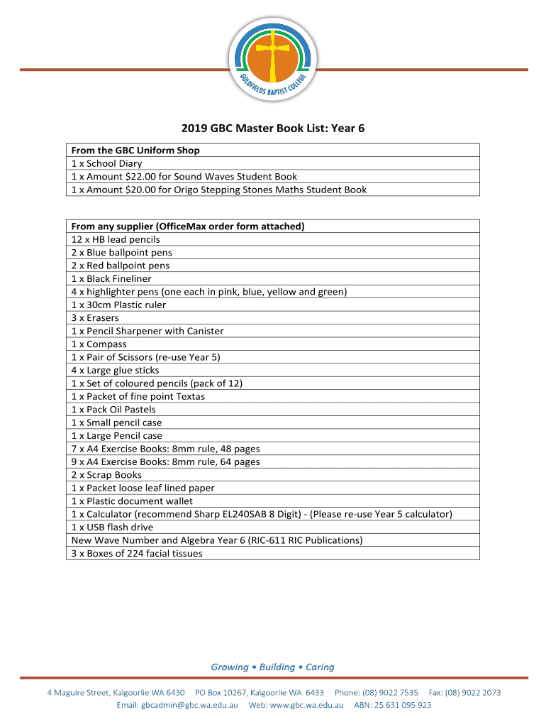 Este documento es una lista de requisitos para los estudiantes de Year 6 en Goldfields Baptist College, incluyendo artículos necesarios de la tienda de uniformes y suministros escolares de OfficeMax.