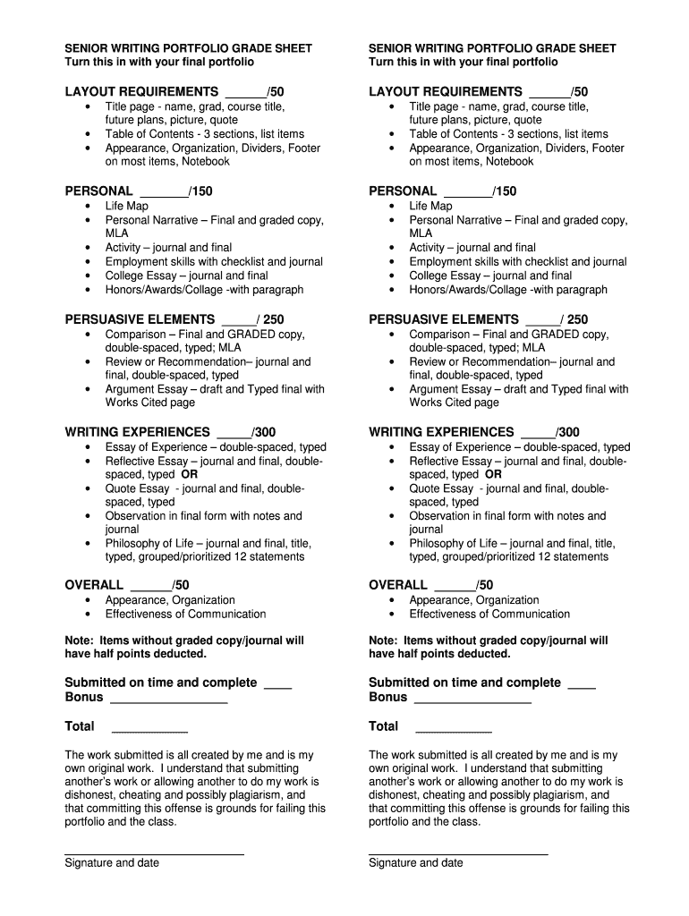 The Senior Writing Portfolio Grade Sheet is a grade sheet template used by students to submit their final writing portfolios for evaluation.