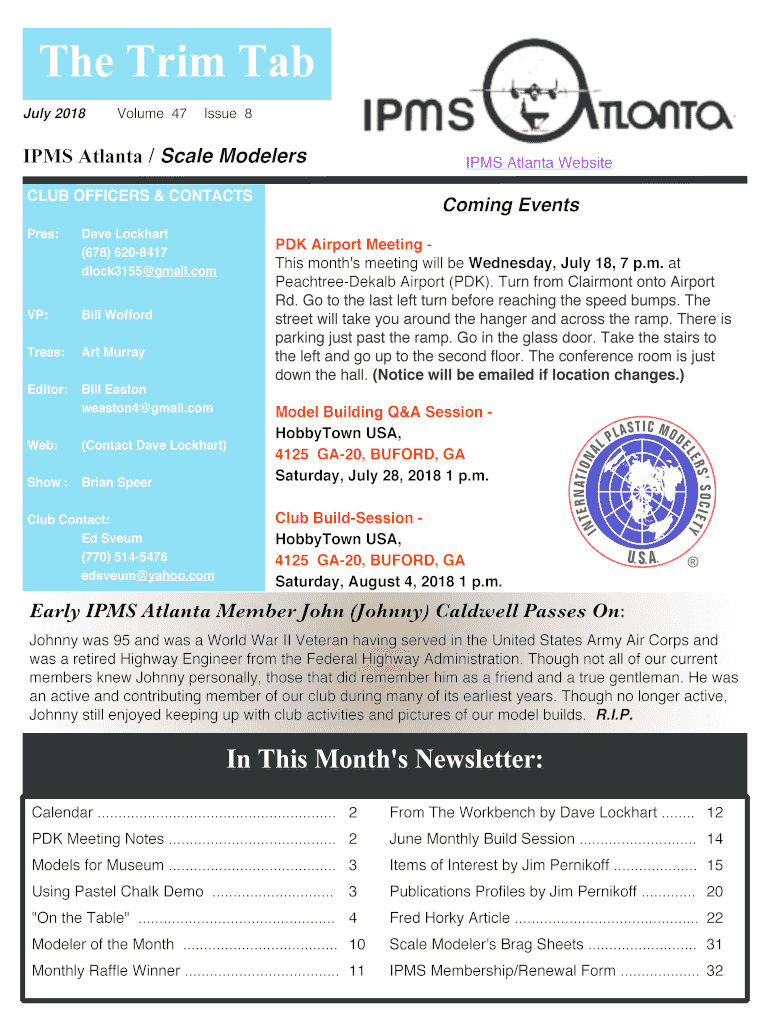 The Trim Tab July 2018Volume 47Issue 8IPMS Atlanta / Scale Modelers CLUB OFFICERS & CONTACTS Pres:Dave Lockhart (678) 6208417 dlock3155 Gmail.comp:Bill WoffordTreas:Art MurrayEditor:Bill Easton weaston4