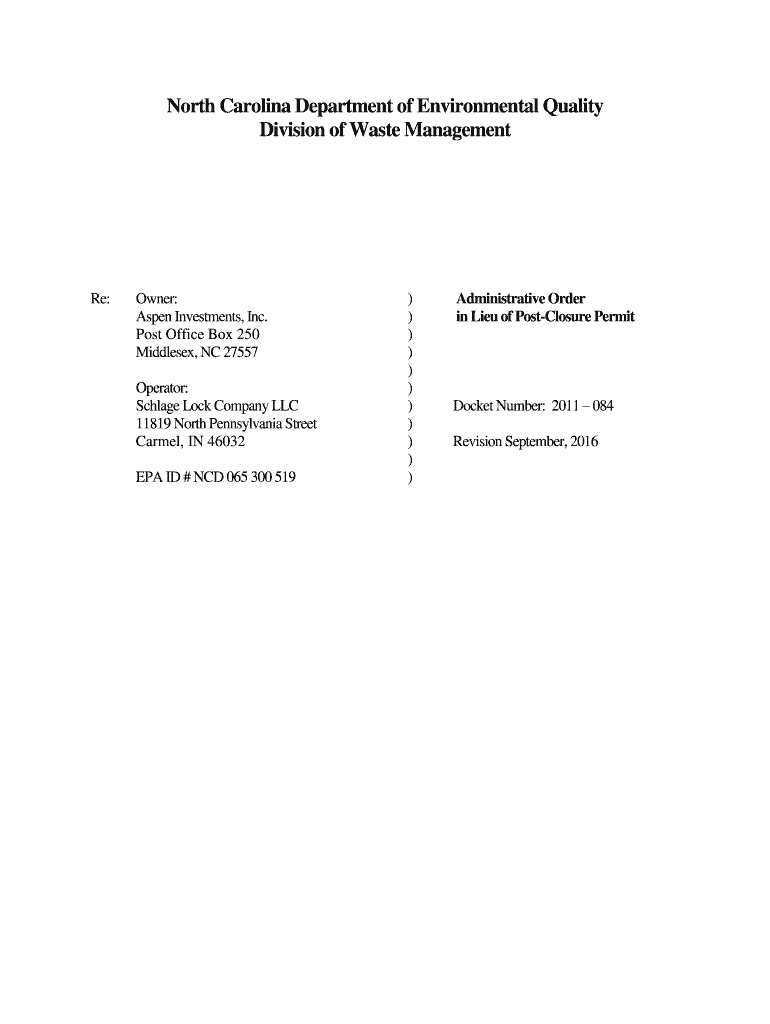 North Carolina Department of Environmental Quality Division of Waste Management Re:Owner: Aspen Investments, Inc. Post Office Box 250 Middlesex, NC 27557 Operator: Silage Lock Company LLC 11819 North