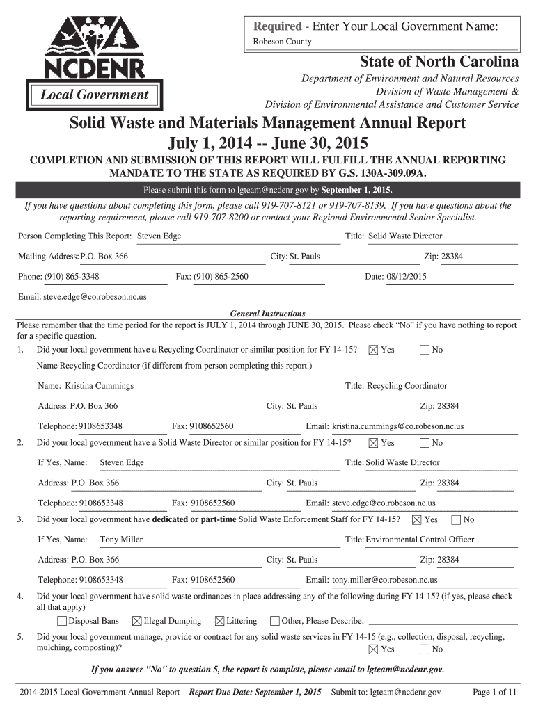 Required Enter Your Local Government Name: Robeson CountyState of North Carolina Department of Environment and Natural Resources Division of Waste Management & Division of Environmental Assistance
