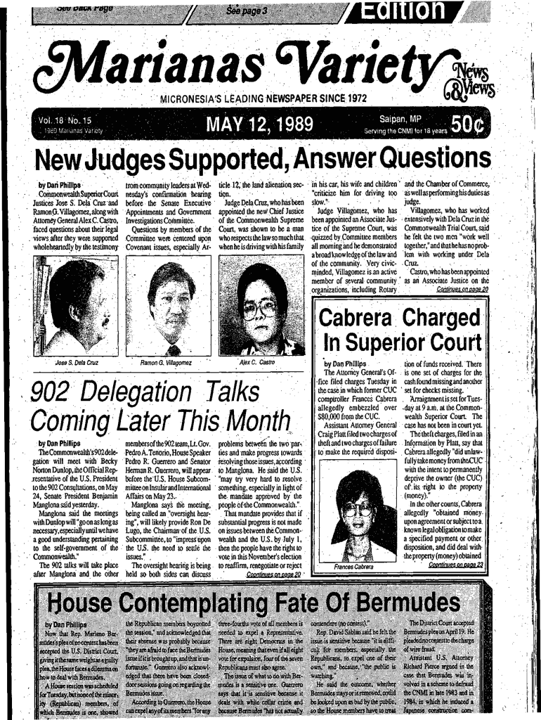 VK n ? O m Mr a g Micronesia IS LEADING NEWSPAPER SINCE 1972MAY 12,1989Vol. 18 N o, 15 .1989 M a RIA n an s V variety Dark PhillipsGommonwealthSuperiorCourt Justices Jose S. Del Cruz and Ramon G.
