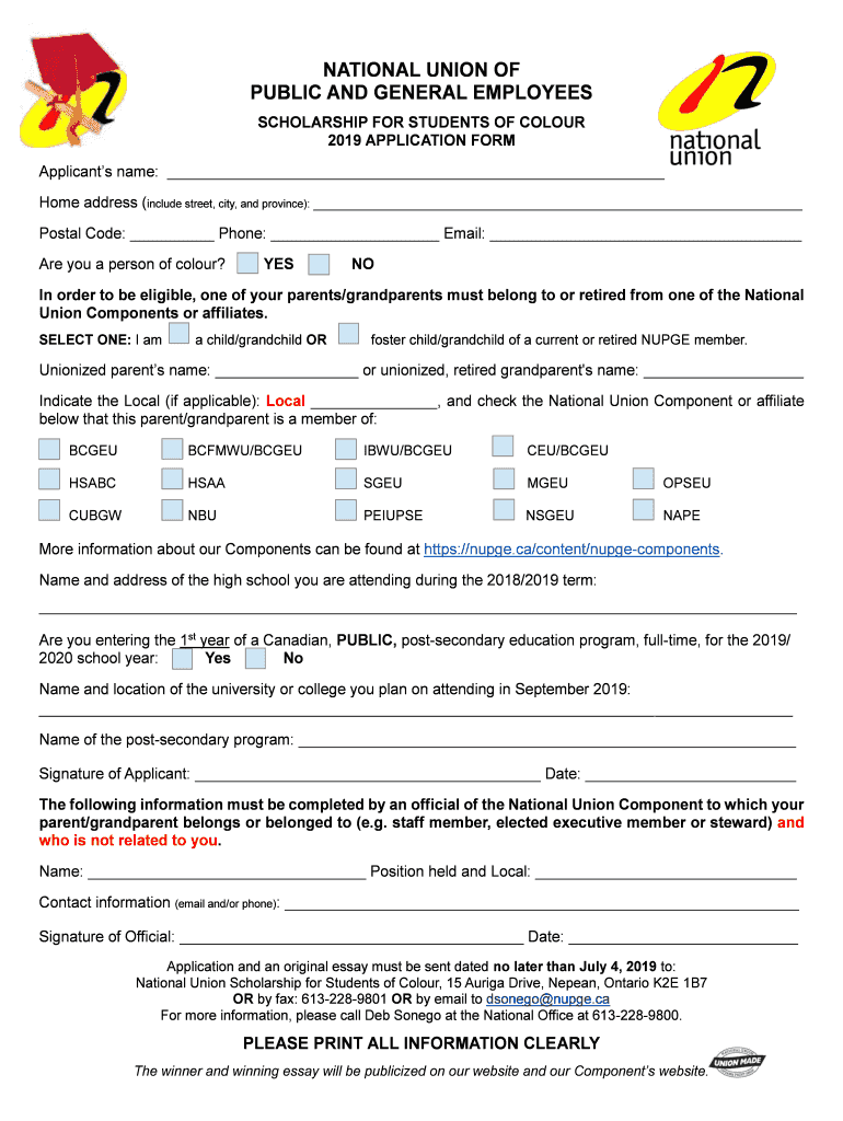 NATIONAL UNION OF PUBLIC AND GENERAL EMPLOYEES SCHOLARSHIP FOR STUDENTS OF Color 2019 APPLICATION FORM Applicants name: Home address (include street, city, and province): Postal Code: Phone: Email: