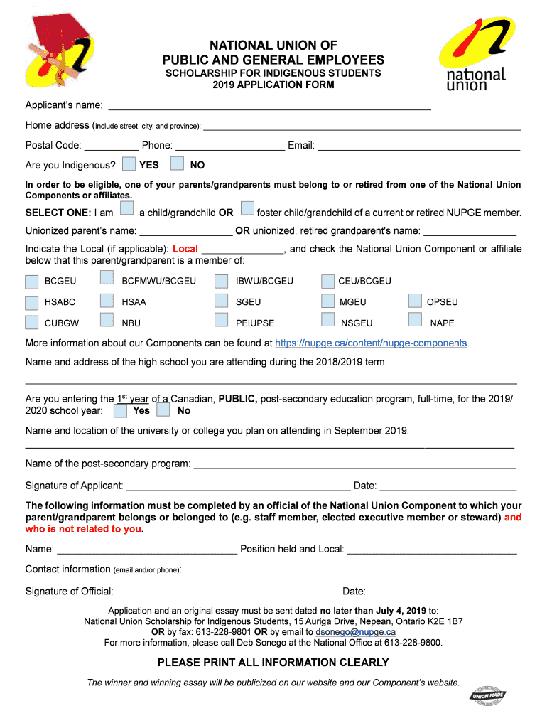 NATIONAL UNION OF PUBLIC AND GENERAL EMPLOYEES SCHOLARSHIP FOR INDIGENOUS STUDENTS 2019 APPLICATION FORM Applicants name: Home address (include street, city, and province): Postal Code: Phone: Email: