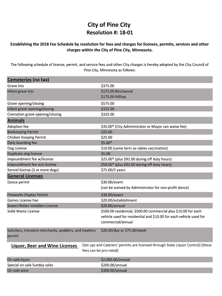 Establishing the 2018 Fee Schedule by resolution for fees and charges for licenses, permits, services and other