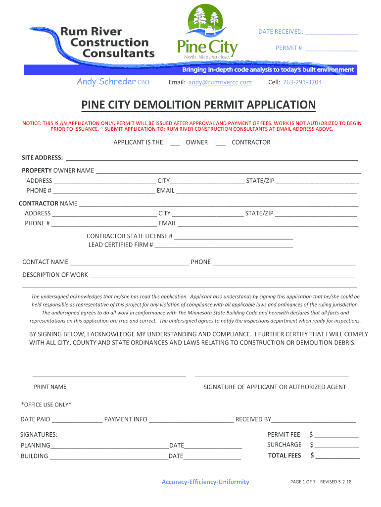 DATE RECEIVED: PERMIT #:Andy Schroeder Email: Andy rumrivercc. Cornell: 7632913704PINE CITY DEMOLITION PERMIT APPLICATION NOTICE: THIS IS AN APPLICATION ONLY. PERMIT WILL BE ISSUED AFTER APPROVAL