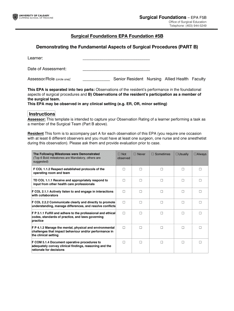 Surgical Foundations EPA F5B Office of Surgical Education Telephone: (403) 9445249Surgical Foundations EPA Foundation #5B Demonstrating the Fundamental Aspects of Surgical Procedures (PART B) Learner: