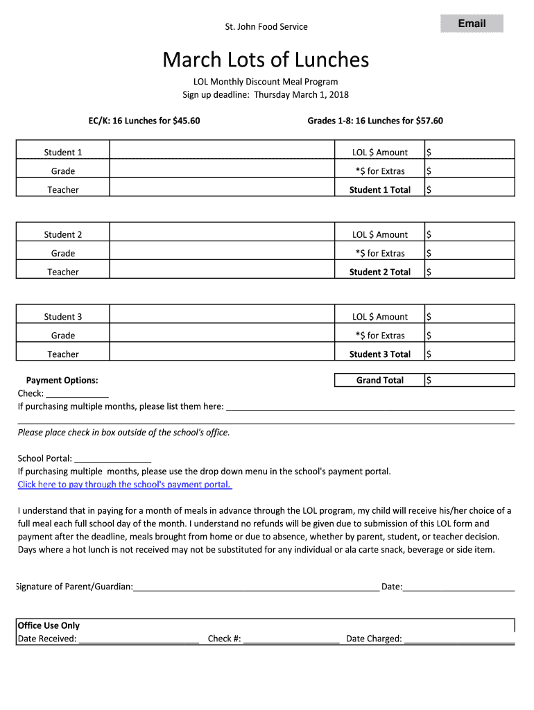 Emails. John Food Service March Lots of Lunches LOL Monthly Discount Meal Program Sign up deadline: Thursday, March 1, 2018, EC/K: 16 Lunches for $45.60Grades 18: 16 Lunches for $57.60Student 1LOL