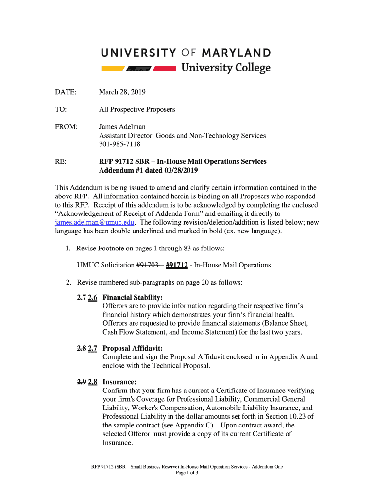 DATE:March 28, 2019TO:All Prospective ProposersFROM:James Adelman Assistant Director, Goods and Nanotechnology Services 3019857118RE:RFP 91712 SBR In House Mail Operations Services Addendum #1 dated