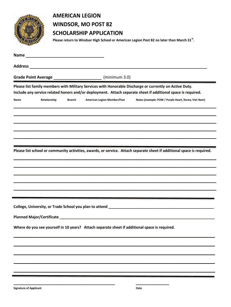 AMERICAN LEGION WINDSOR, MO POST 82 SCHOLARSHIP APPLICATION please return to Windsor High School or American Legion Post 82 no later than March 31. Name Address Grade Point Average (minimum 3.0) Please