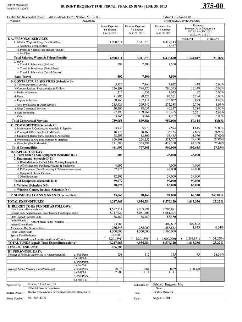 State of Mississippi Form MBR1 (2009)Central MS Residential Center37500BUDGET REQUEST FOR FISCAL YEAR ENDING JUNE 30, 2013 701 Northside Drive, Newton, MS 39345AGENCYEdwin C. Legrand, IIIADDRESSCHIEF