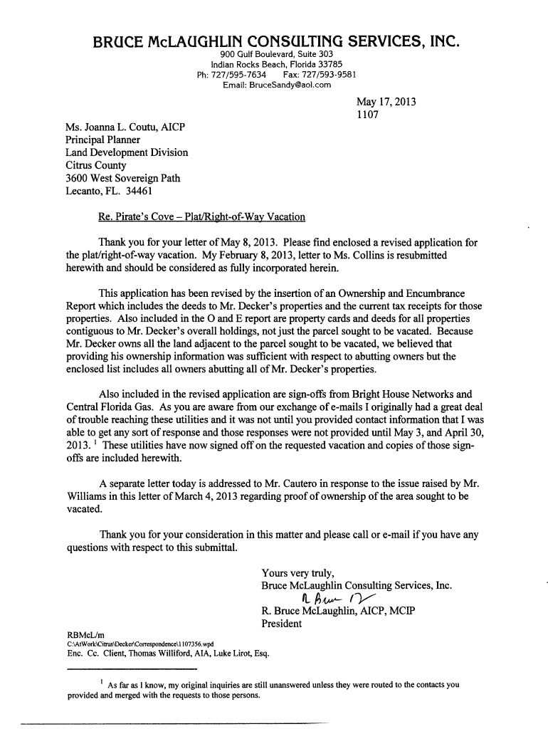 BRUCE M. McLaughlin CONSULTING SERVICES, INC. 900 Gulf Boulevard, Suite 303Indian Rocks Beach, Florida 33785Ph: 727/5957634 Fax: 727/5939581Email: Bruce Sandy AOL.comma 17, 2013 1107 Ms. Joanna L.