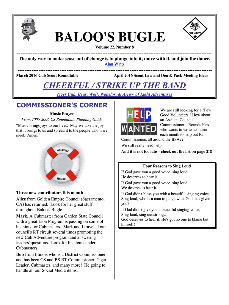 ALSO IS BUGLE Volume 22, Number 8The only way to make sense out of change is to plunge into it, move with it, and join the dance. Alan Watts March 2016 Cub Scout RoundtableApril 2016 Scout Law and