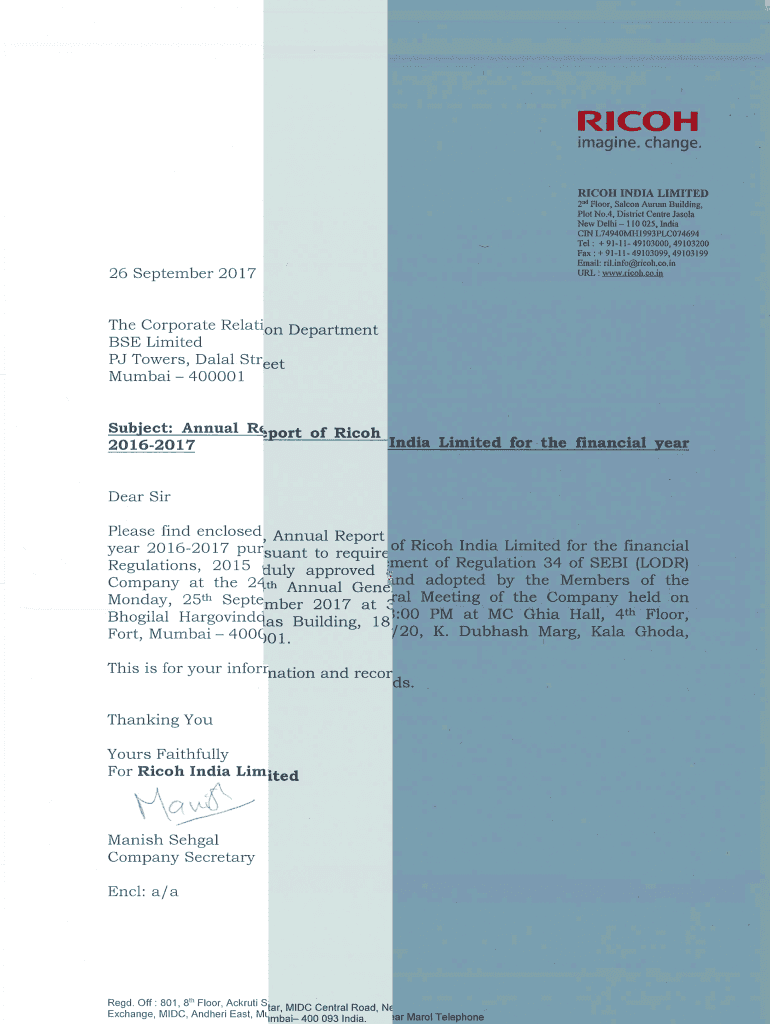 RICOH INDIA LIMITED Registered Office: 801, 8th Floor, Acute Star, MID Central Road, Near Carol Telephone Exchange, MID, Adhere East, Mumbai 400 093 Tel: 022 66833000, Fax: 022 67032099 Corporate