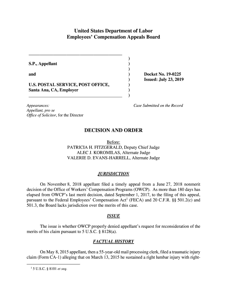 United States Department of Labor Employees Compensation Appeals Board S.P., Appellant and U.S. POSTAL SERVICE, POST OFFICE, Santa Ana, CA, Employer))))))))Appearances: Appellant, pro SE Office of