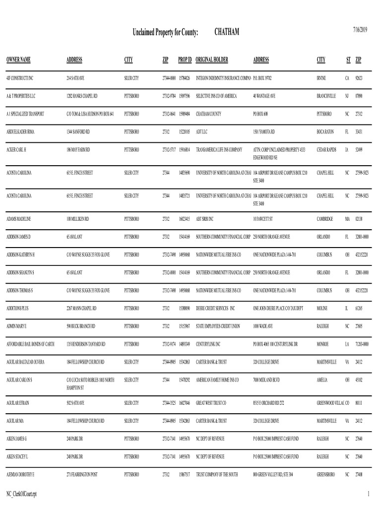 Unclaimed Property for County: OWNER NAMEADDRESSCITYZIP4JF CONSTRUCT INC214 S 6TH WRESTLER CITY27344000015784026INTEGON INDEMNITY INSURANCE COMPANY. O. BOX 19702IRVINECA92623A & T PROPERTIES LLC1282