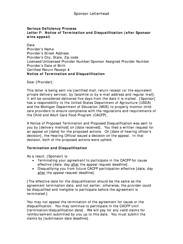 Sponsor LetterheadSerious Deficiency Process Letter F: Notice of Termination and Disqualification (after Sponsor wins appeal) Date Providers Name Providers Street Address Providers City, State, Zip