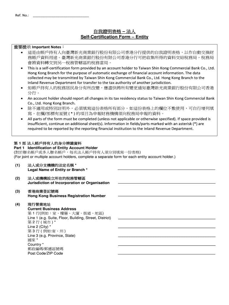 Ref. No.: Recertification Form Entity Important Notes This is a self certification form provided by an account holder to Taiwan Shin Kong Commercial Bank Co