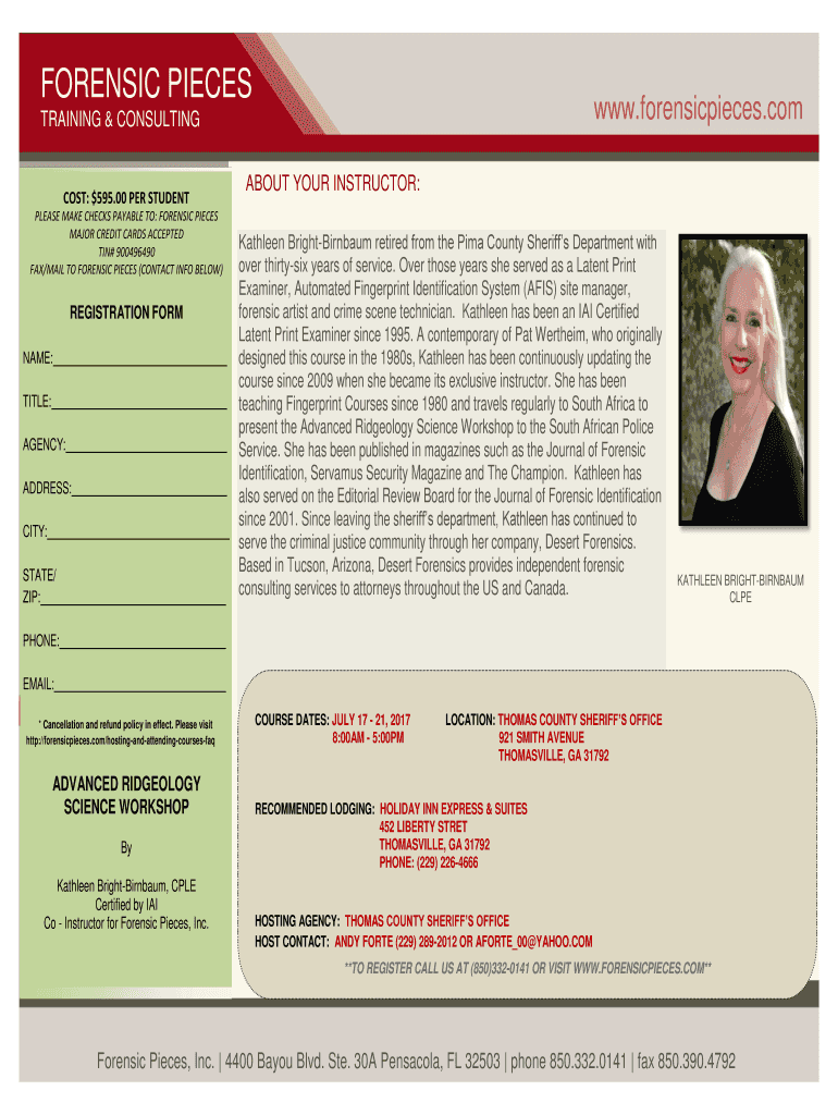 FORENSIC Pieces. Forensic pieces. Containing & CONSULTINGCOST: $595.00 PER STUDENT PLEASE MAKE CHECKS PAYABLE TO: FORENSIC PIECES MAJOR CREDIT CARDS ACCEPTED TIN# 900496490 FAX/MAIL TO FORENSIC PIECES
