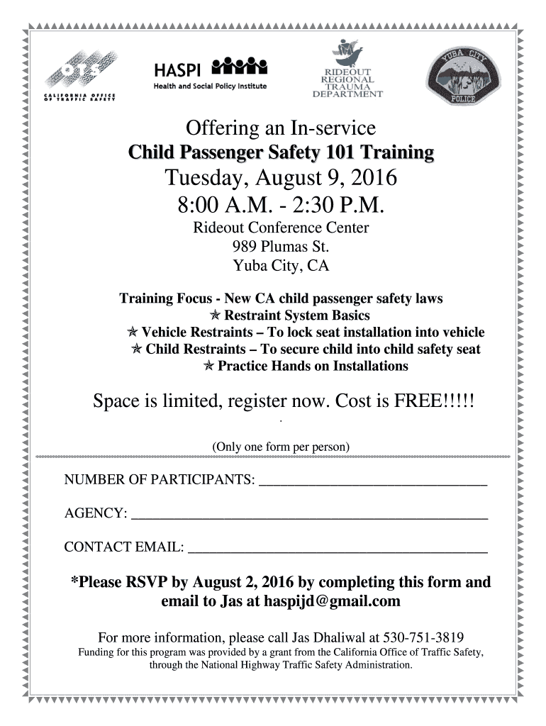 Offering an In service Child Passenger Safety 101 Training Tuesday, August 9, 2016 8:00 A.M. 2:30 P.M. Hideout Conference Center 989 Plumes St. Cuba City, CA Training Focus New CA child passenger