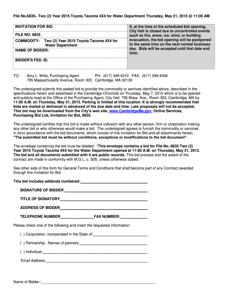 File No.6835 Two (2) Year 2015 Toyota Tacoma 4×4 for Water Department Thursday, May 21, 2015 11:00 AM INVITATION FOR BID FILE NO: 6835 COMMODITY:Two (2) Year 2015 Toyota Tacoma 4×4 for Water Department