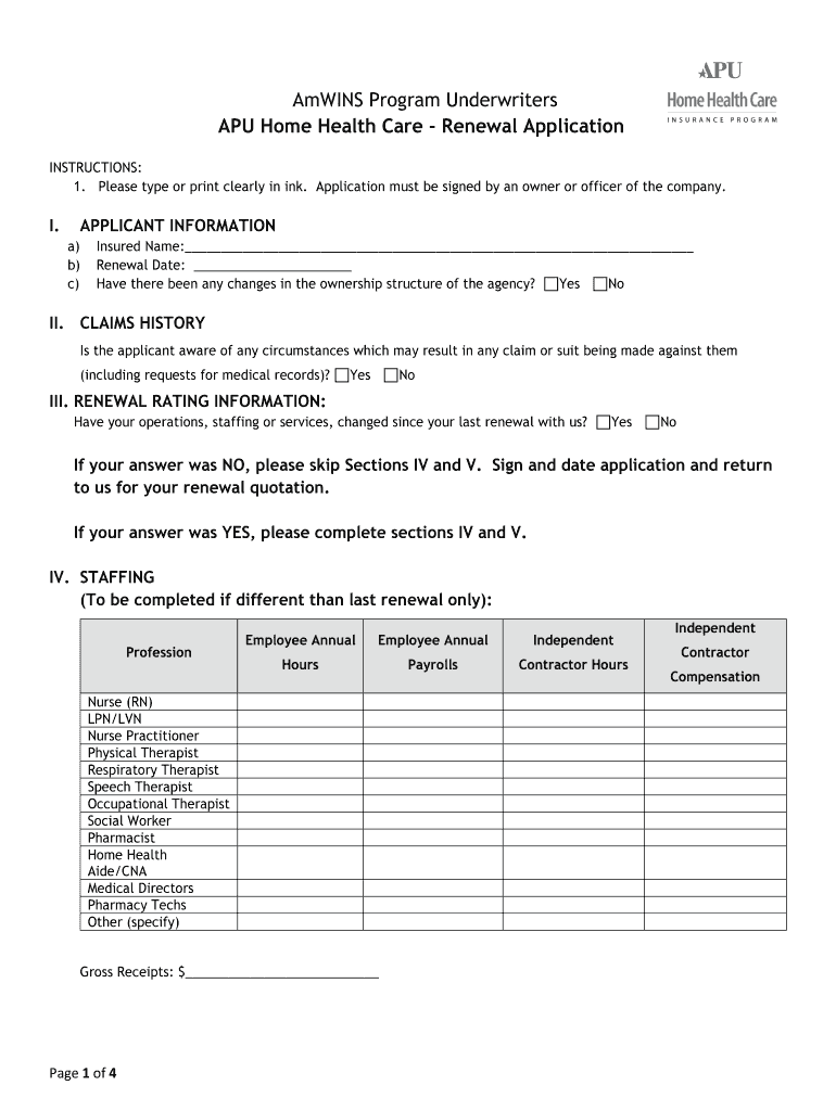 Wins Program Underwriters APU Home Health Care Renewal Application INSTRUCTIONS: 1. Please type or print clearly in ink. Application must be signed by an owner or officer of the company. I.APPLICANT