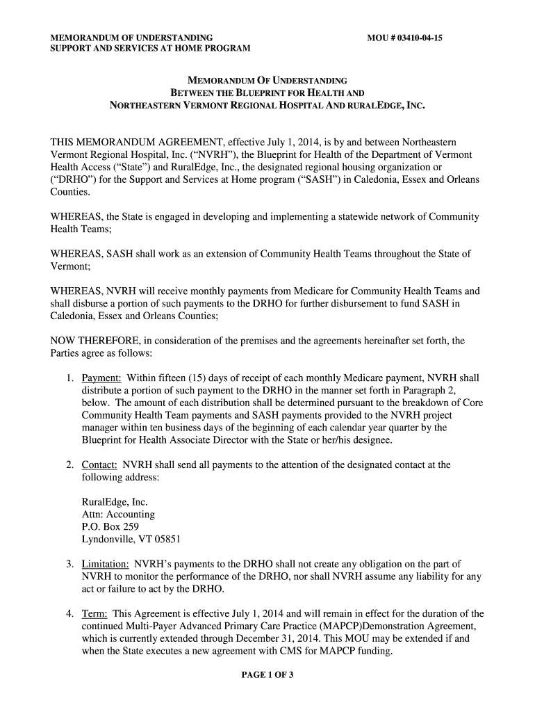 SUPPORT AND SERVICES AT HOME PROGRAMMED # 034100415MEMORANDUM OF UNDERSTANDING