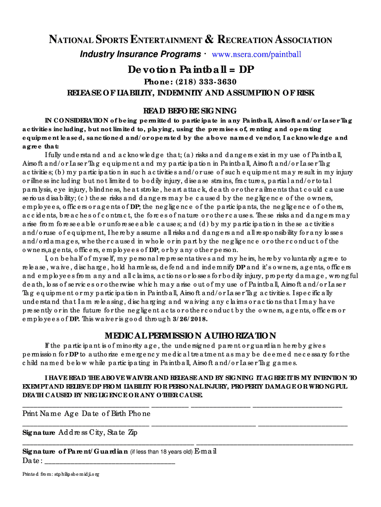 NATIONAL SPORTS ENTERTAINMENT & RECREATION ASSOCIATION Industry Insurance Programs www.nsera.com/paintballDevotion Paintball DP Phone: (218) 3333630 RELEASE OF LIABILITY, INDEMNITY AND ASSUMPTION