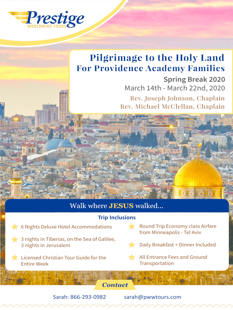 Pilgrimage to the Holy Landform Providence Academy Families Spring Break 2020 March 14th March 22nd, 2020 Rev. Joseph Johnson, Chaplain Rev. Michael McClellan, ChaplainWalk where JESUS walked... Trip