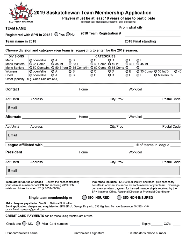 2019 Saskatchewan Team Membership ApplicationPlayers must be at least 18 years of age to participate (contact your Regional Director for any exceptions)From what CityScan NAME Registered with SON