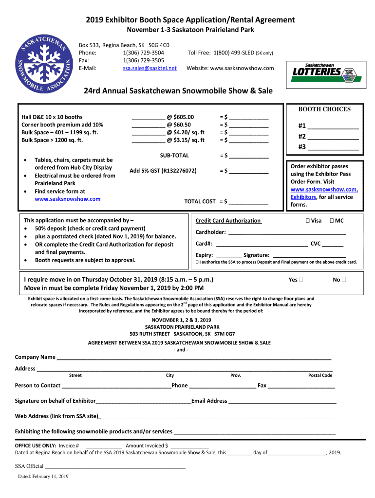 2019 Exhibitor Booth Space Application/Rental Agreement November 13 Saskatoon Prairie land Paradox 533, Regina Beach, SK S0G 4C0 Phone: 1(306) 7293504 Fax: 1(306) 7293505 Email: SSA. Sales pastel.