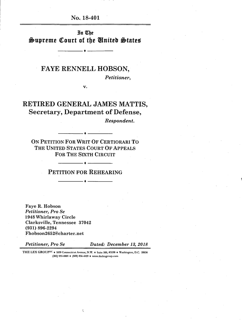 No. 18401Jn He 'supreme Court of the United btatvgFAYE WENDELL HOBSON, Petitioner, V.RETIRED GENERAL JAMES MATHIS, Secretary, Department of Defense, Respondent. ON PETITION FOR WRIT OF CERTIORARI