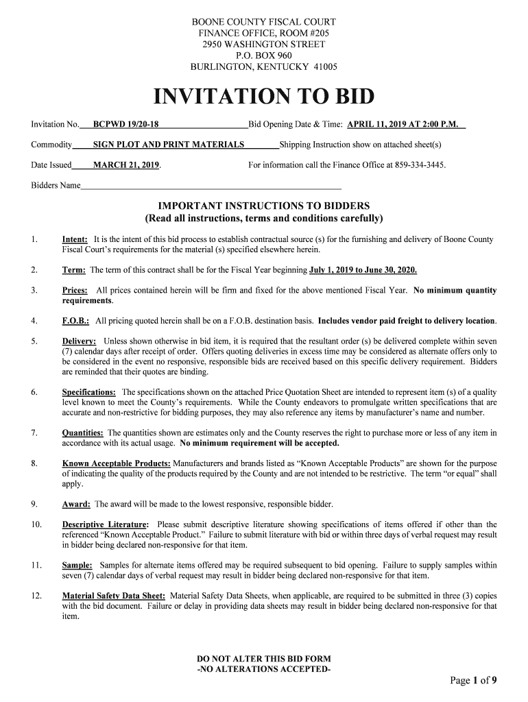 BOONE COUNTY FISCAL COURT FINANCE OFFICE, ROOM #205 2950 WASHINGTON STREET P.O. BOX 960 BURLINGTON, KENTUCKY 41005INVITATION TO BID Invitation No. BCP WD 19/2018Bid Opening Date & Time: APRIL 11,