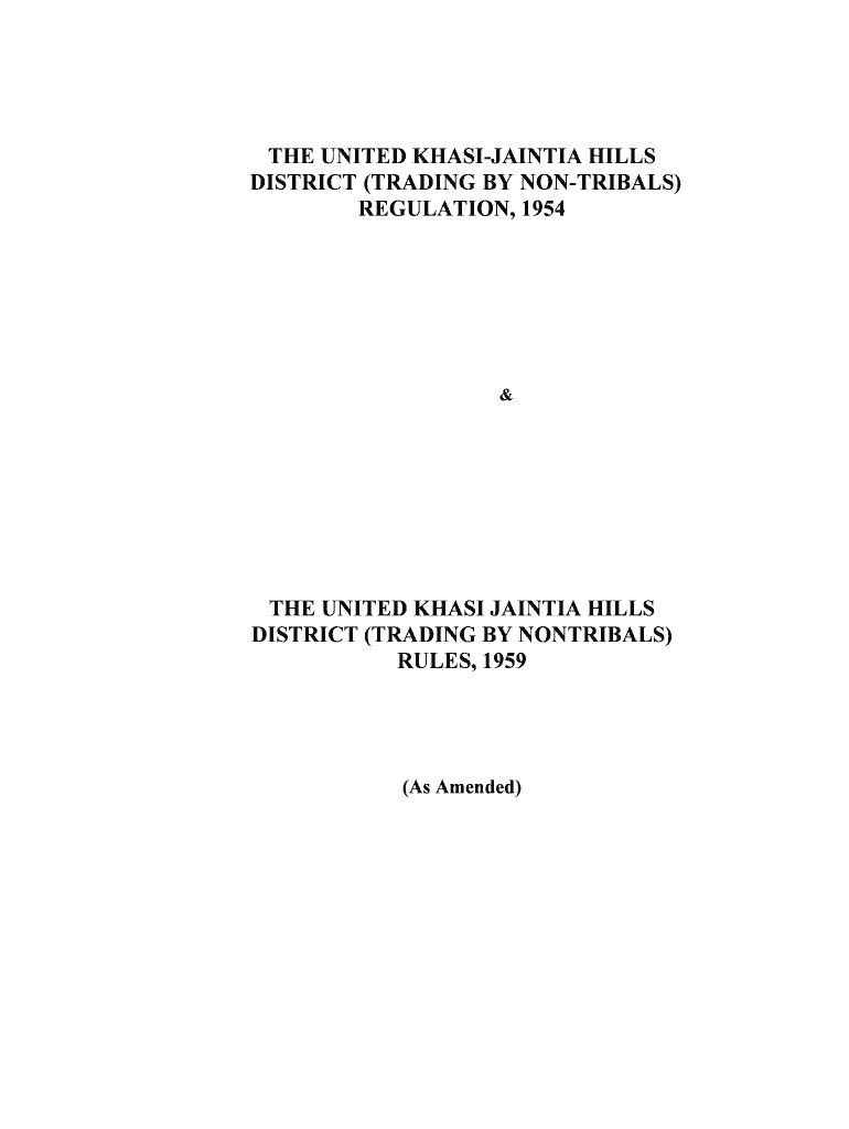 THEUNITEDKHASIJAINTIAHILLS DISTRICT (TRADING BY NOSTRILS) REGULATION,1954 & THEUNITEDKHASIJAINTIAHILLS DISTRICT(TRADINGBYNONTRIBALS) RULES,1959 (Amended) 2 THEUNITEDKHASIJAINTIAHILLS DISTRICT(TRADINGBYNONTRIBALS)