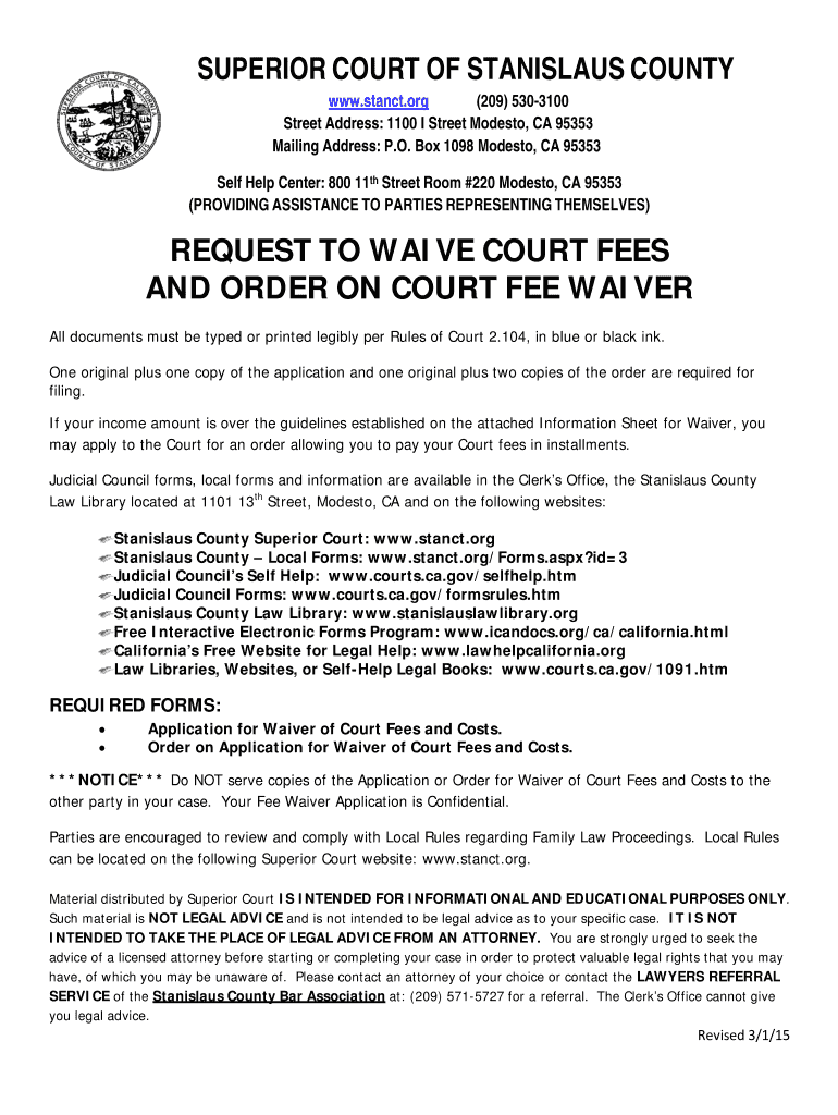Mailing Address: P.O. Box 1098 Modesto, CA 95353Self Help Center: 800 11th Street Room