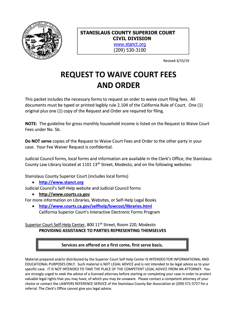 Get the free request to waive court fees and order - Stanislaus County Superior Court
