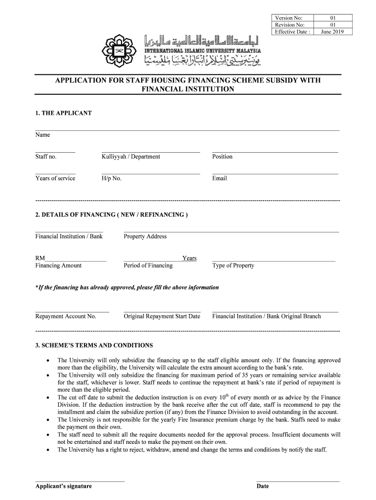 Version No: Revision No: Effective Date :01 01 June 2019APPLICATION FOR STAFF HOUSING FINANCING SCHEME SUBSIDY WITH FINANCIAL INSTITUTION 1. THE APPLICANT Name Staff no. Kulliyyah / Department Position