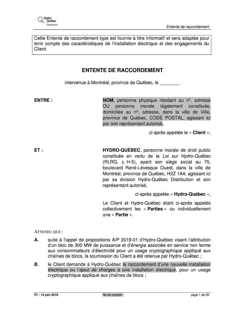 L'entente de raccordement chanes doit être remplie en indiquant clairement les conditions de connexion et en respectant les exigences réglementaires en vigueur.