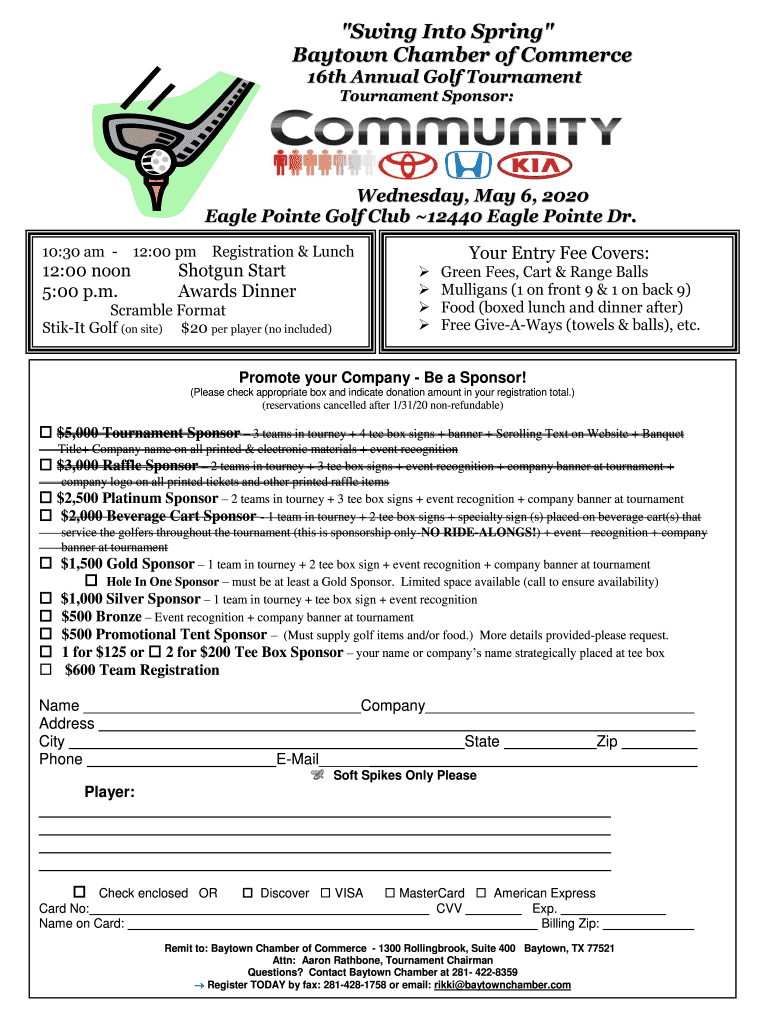 “Swing Into Spring Baytown Chamber of Commerce 16th Annual Golf Tournament Sponsor:Wednesday, May 6, 2020, Eagle Point Golf Club 12440 Eagle Point Dr. 10:30 am 12:00 noon 5:00 p.m.12:00 your Entry