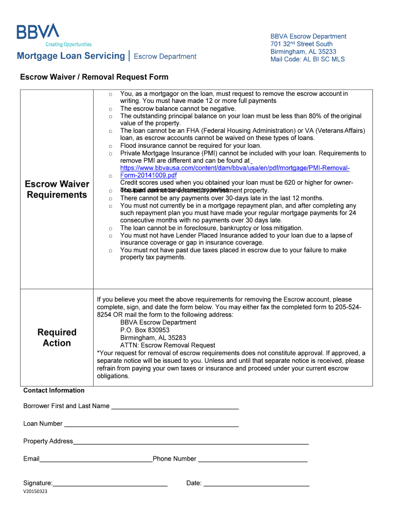 Mortgage Loan Servicing Escrow Department BBVA Escrow Department 701 32nd Street South Birmingham, AL 35233 Mail Code: AL BI SC Escrow Waiver / Removal Request Form o o o o o escrow Waiver Requirements