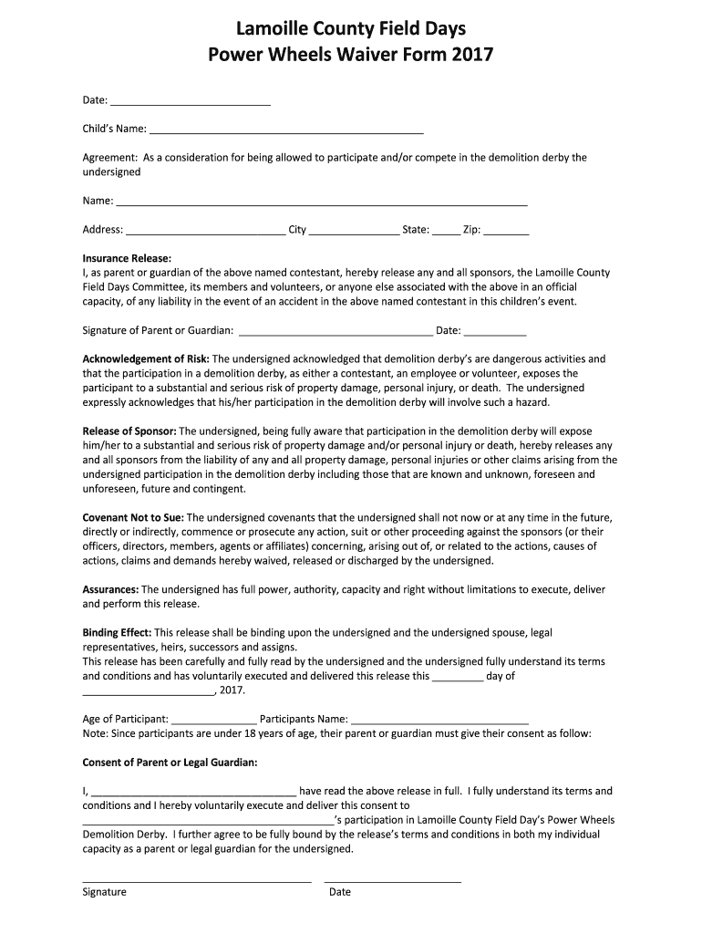 Camille County Field Days Power Wheels Waiver Form 2017 Date: Child's Name: Agreement: As a consideration for being allowed to participate and/or compete in the demolition derby the undersigned Name: